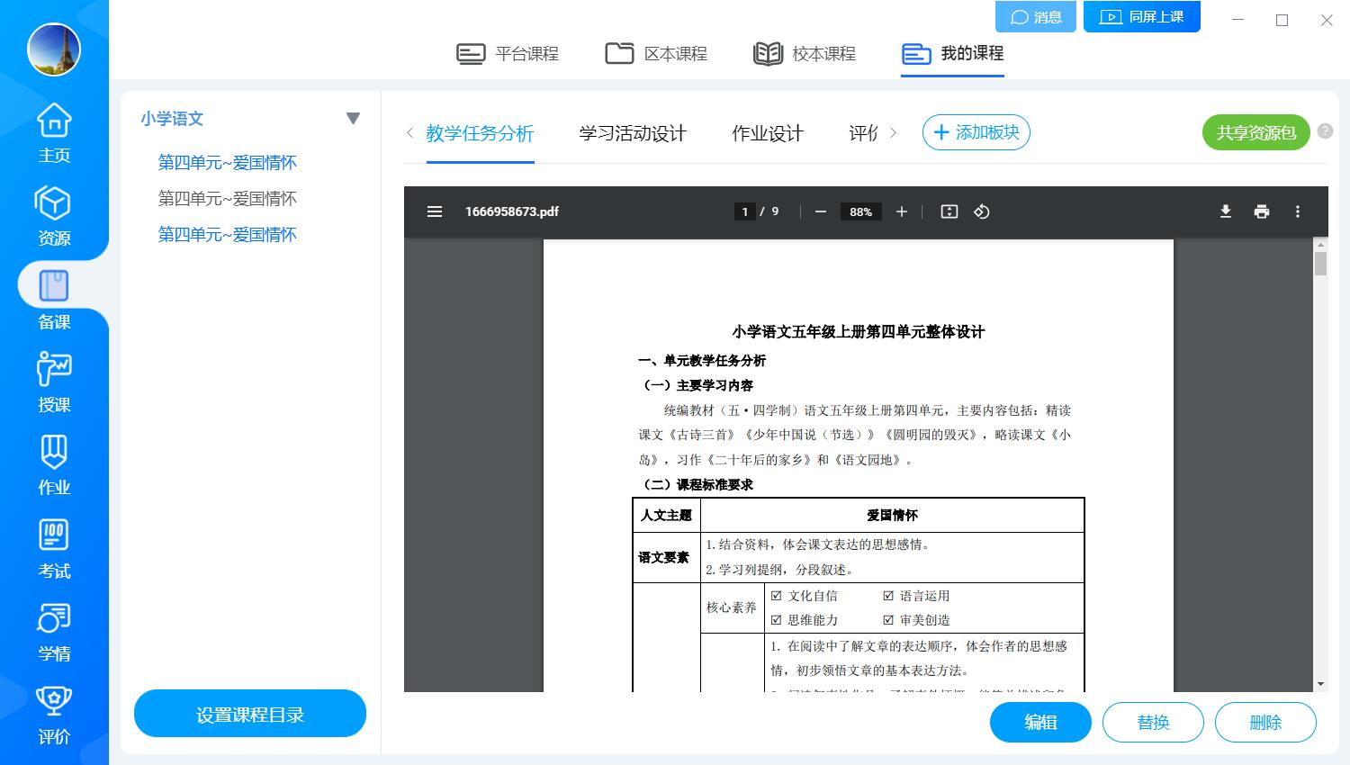 支持按平台、区、校级自定义配置公共课程栏目,按需配置管理员,支持自定义创建课程,指派建设、审核老师,支持建设老师共享个人课程资源包,促进课程资源包的共建共享。
