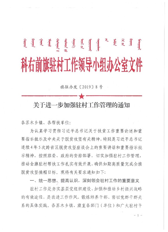 现将科右前旗驻村工作领导小组办公室文件《关于进一步加强驻村工作管理的通知》(旗驻办发〔2019〕8号)转发给你们,请按要求贯彻落实。