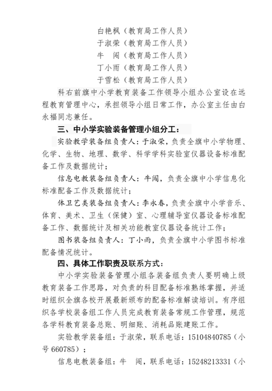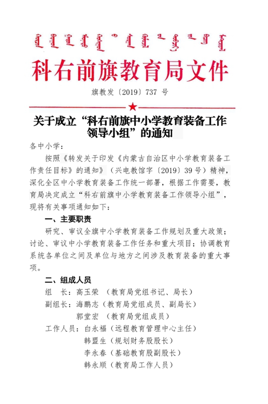关于成立“ 科右前旗中小学教育装备工作领导小组 ”的通知