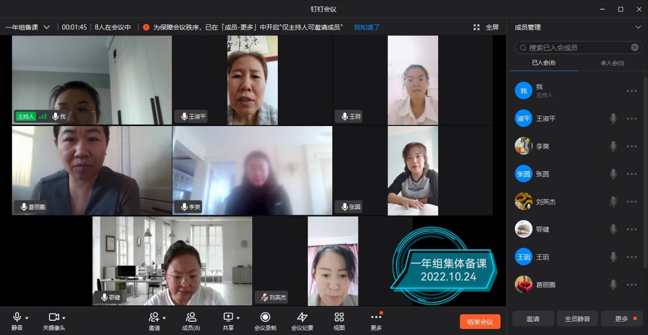 仔细研学,有所感亦有所悟。观摩课后,大家针对任课教师的教学方式、教学内容以及设计的各个教学环节等方面进行线上评议和交流,并结合各自的教学经验提出了相应的意见和建议。取人之长,补己之短。在交流研讨中,年轻教师的评课能力又在无声的进步;她们有的结合自己的教学实际,谈到讲练结合;有的反思自己的语言风格,稍欠温柔;有的关注小视频的运用,如果用到平舌音和翘舌音的教学中,孩子们会掌握得更快、更好;有的看到连麦中个别孩子看不到画面,怎么处理会更好;还有的想到了新课程标准中建议汉语拼音教学“要尽可能有趣味性,要有适宜的活动和游戏,与说普通话、识字教学相结合”。最后,针对近期的线上语文教学提出了自己的问题,大家交流解决的方法。