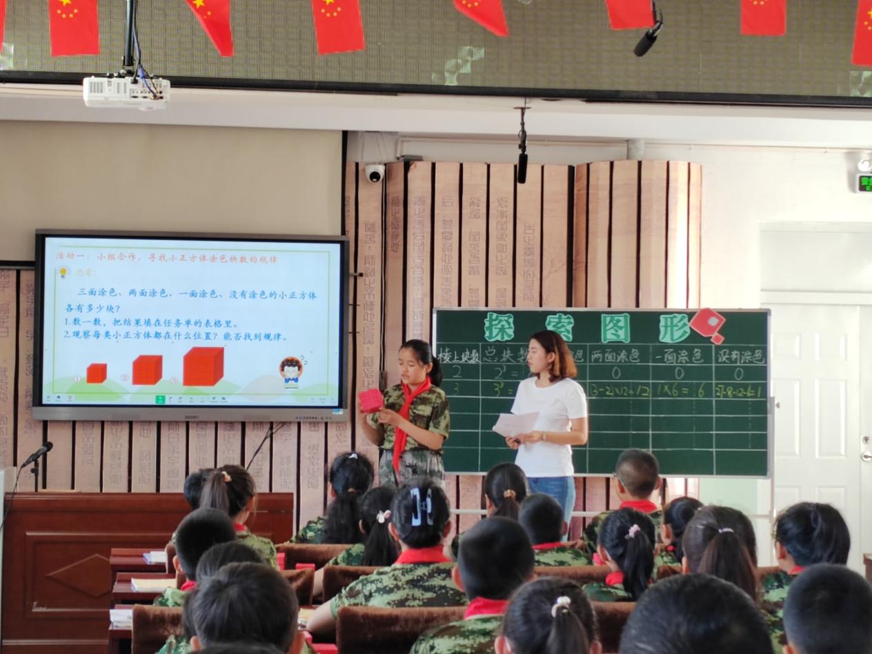 光明小学的安老师讲授了五年级下册的《探索图形》,本节课是根据学生年龄特征及视野广度而设计的解决问题的综合与实践活动课。学生通过实际操作、观察、列表、演示、想象等活动,发现小正方体涂色情况的位置特征和规律,体会化繁为简解决问题的策略,培养学生的空间想象能力。在探索图形的过程中,教师注重以学生为主体,借助学生学习的重要方式——动手实践、自主探究与合作交流,使学生多种感官参与学习过程,重视培养学生的猜测、推理能力和探索精神,感受数学的乐趣,激发主动探索、用于实践的精神和实事求是的科学态度。