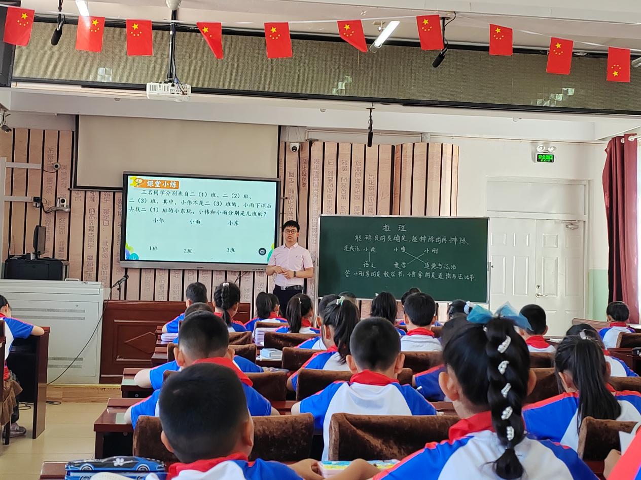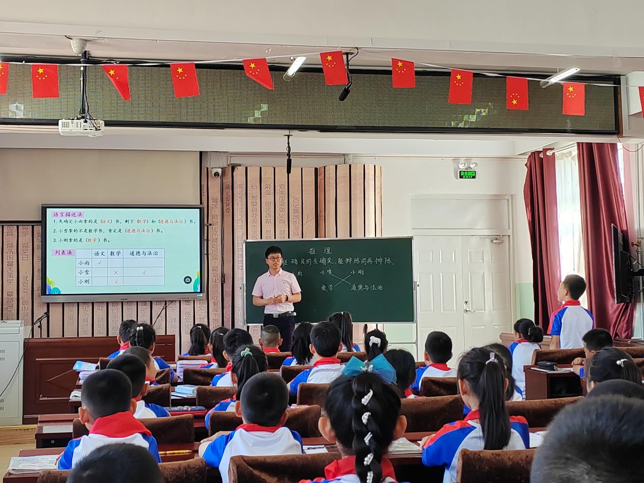 伊敏小学的王老师讲授了二年级下册的《推理》,本课是一节非常有趣的数学活动课,也是逻辑思维训练的起始课。课堂上学生根据提供的信息,进行判断、推理并得出结论,使学生初步接触和运用排除法,运用操作、实验、猜测等直观手段解决这些问题,渗透运用数学中排除法的思想,培养学生有序地、全面地思考问题的意识。本节课以游戏的形式为主,让学生通过生动有趣、形式多样的猜测、推理游戏,使学生在具体的情境中感受简单的推理过程,获得一些简单的推理经验,提高学生的分析能力与合作能力。
