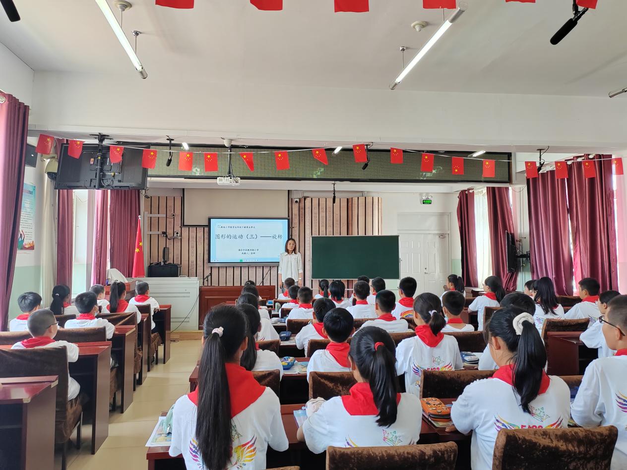 胜利街小学的张老师讲授了五年级下册第五单元的《图形的旋转》,本节课注重学生的动手操作,引导学生在大量的操作活动中掌握图形旋转的方法。本课时的教学贯穿一条知识结构化的明线和一条数学核心素养的暗线,培养学生数学思维能力,发展空间观念。遵循运动演绎的知识逻辑,把图形的旋转,线段的旋转,面的旋转,有机整合在一起。有效沟通点线面的联系,促进学生思维水平向关联结构发展,学生在这样的沟通中理解掌握旋转现象的三要素和旋转特征。