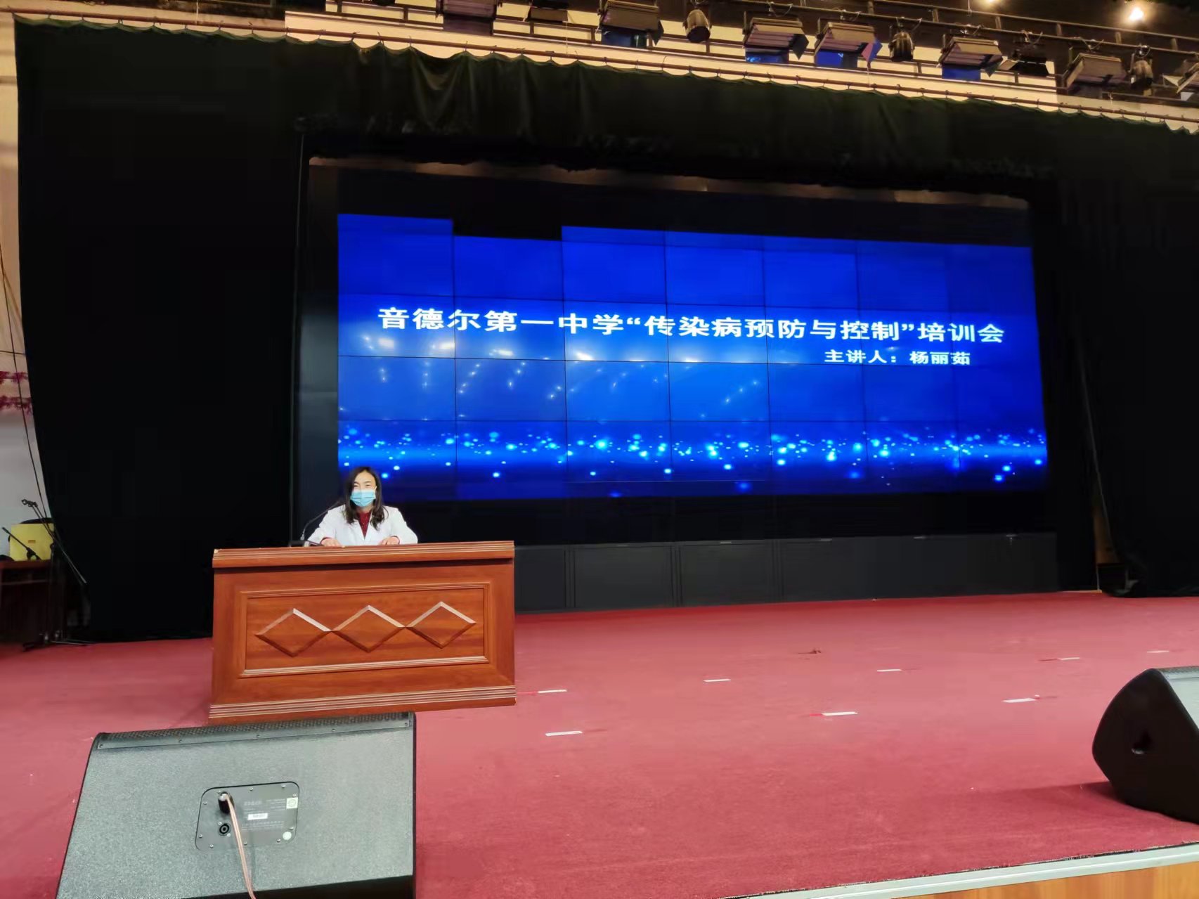 由校医杨丽茹进行了传染病预防与控制讲座、全体教职工认真听讲。