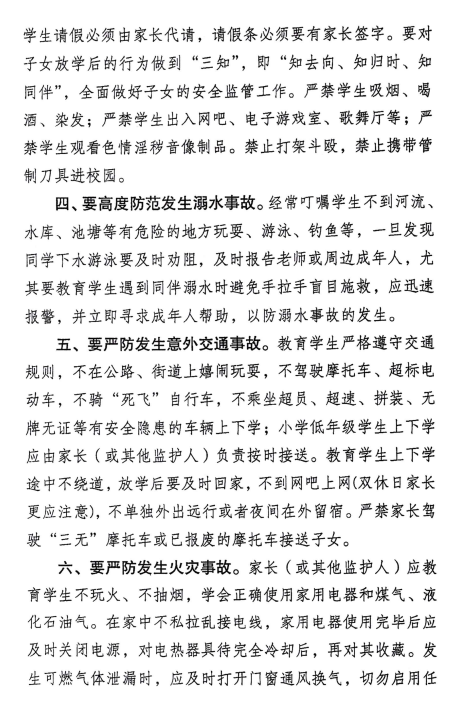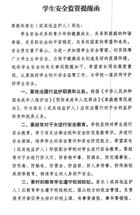 学生安全监管提醒函