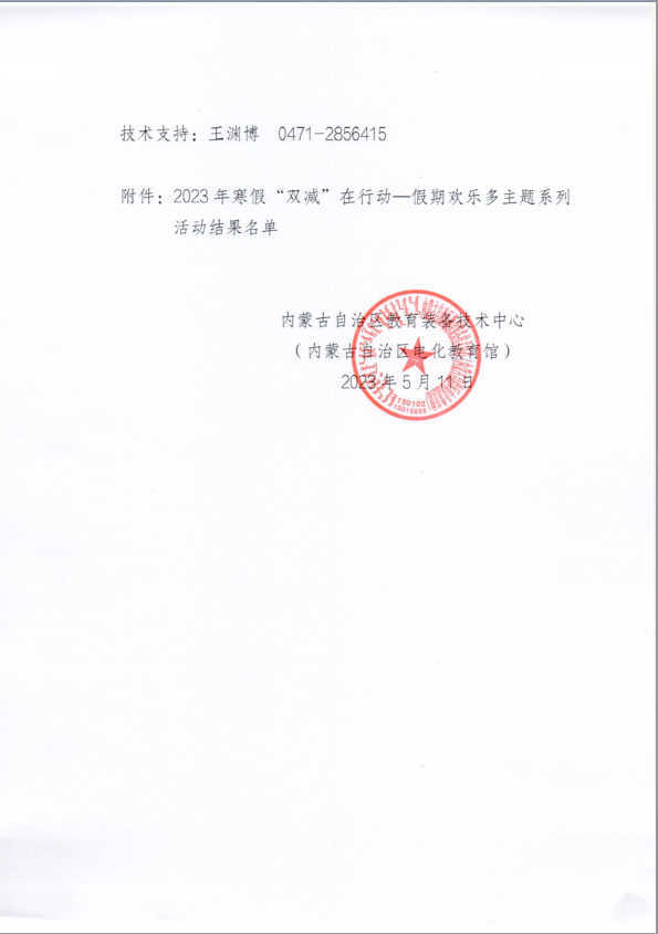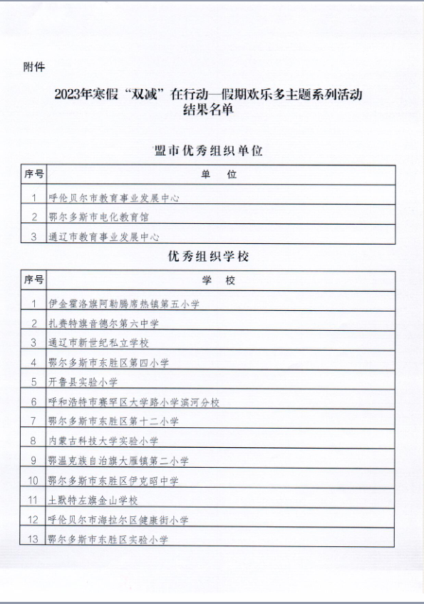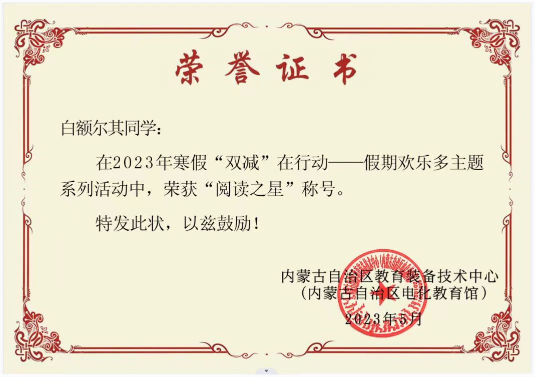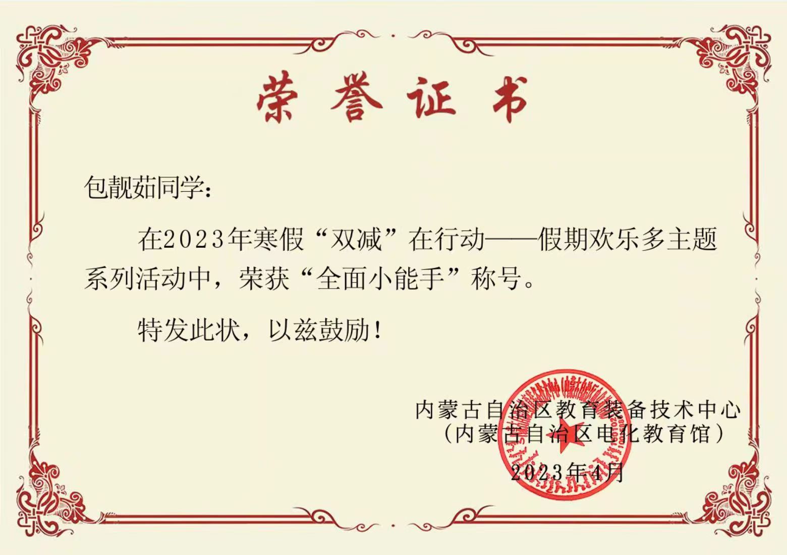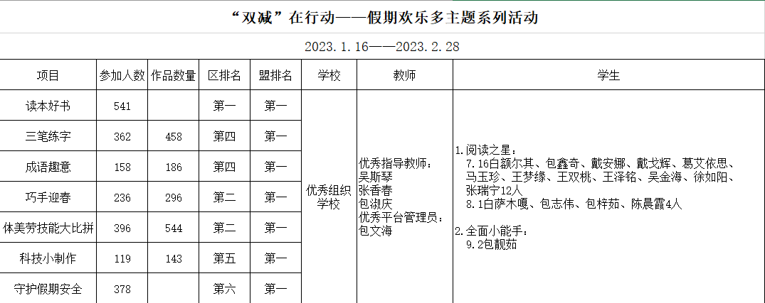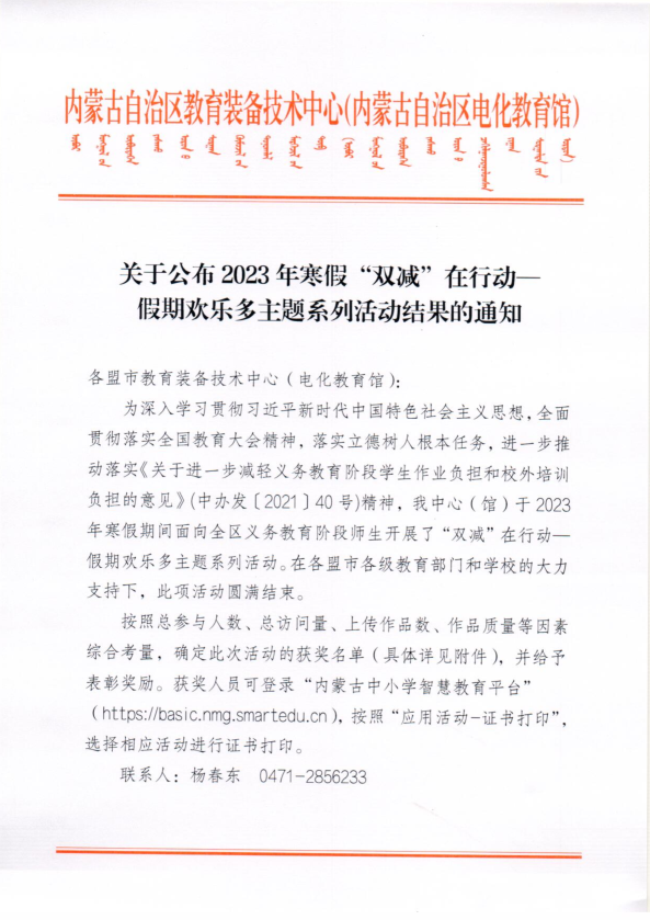 按照内蒙古自治区教育装备技术中心《关于开展2023年寒假“双减”在行动——假期欢乐多主题系列活动的通知》,认真落实文件精神及活动内容要求,引导学生及教师利用寒假时间参与各项活动,从活动中收获知识、展示技能、拓展思维,在促进学生提升阅读素养,增强劳动意识和科技创新能力上起到积极作用,养成自主学习、规划生活的好习惯。本次活动开展于2023年1月16日—2023年2月28日。学生及教师通过内蒙古中小学智慧教育平台和“人人通空间”手机客户端参与活动,利用寒假时间,一起读一本好书、享一段美文、练一笔好字;一起参加体美劳动技能大比拼;一起学习成语典故、记录春节民俗,传承中华优秀传统文化;一起学习安全知识,提高安全防范意识,提升自我保护能力,共同度过一个安全健康、丰富多彩的寒假!